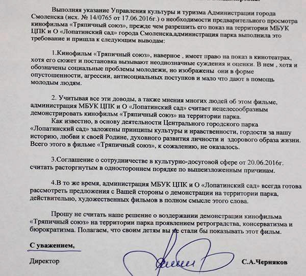 Директор смоленского парка культуры некий Черняков запретил на территории парка демонстрацию хорошего российского фильма "Тряпичный союз". Потому что он, понимаешь, личность духовно не развивает у директора. Ведь в парк культуры заложены принципы культуры и нравственности, а тут, понимаешь, какая-то там мОлодежь озабочена коррупцией в стране. Давить такое, конечно.