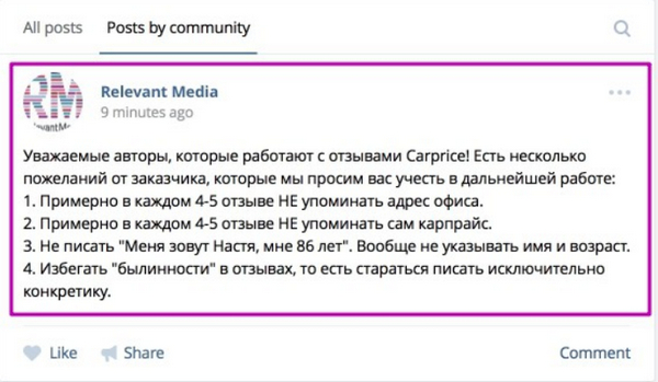 Информация о крупном заказе появилась в закрытом сообществе для авторов RelevantMedia во «ВКонтакте». Из-за нового формата инструкция для исполнителей была опубликована на отдельной странице сайта компании.