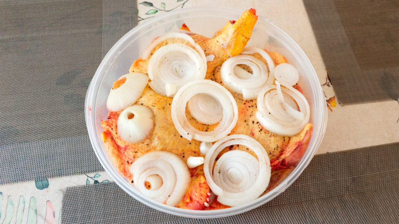 Принес домой, замариновал обычным образом для решетки: соль, перец, кольца лука, которые нужно пожамкать, немного белого вина для ускорения процесса.