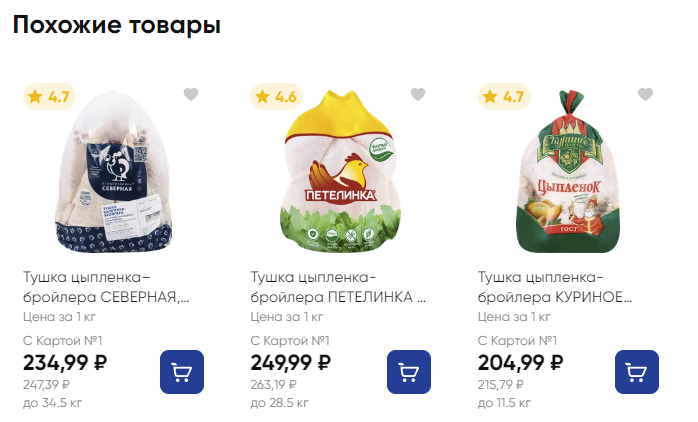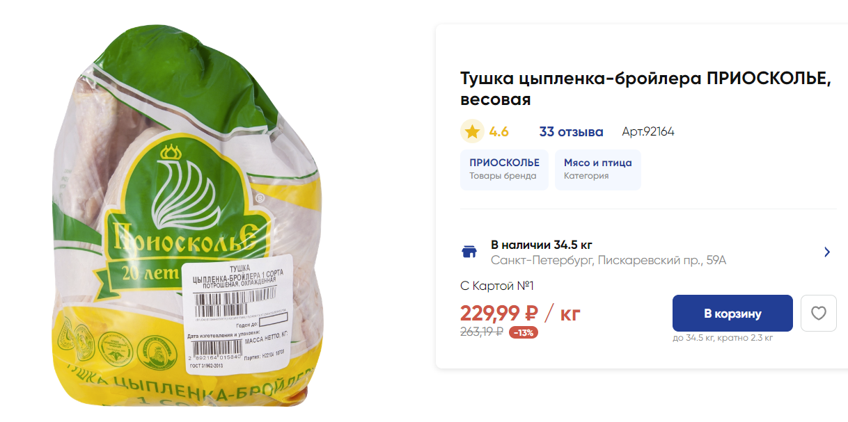 Надо еще с Азбукой вкуса сравнить )) Тогда еще драматичнее будет. А по факту тушки начинаются от примерно 150-160 р за кг. Что-нибудь подороже, типа Петелинки - 250 р за кг.