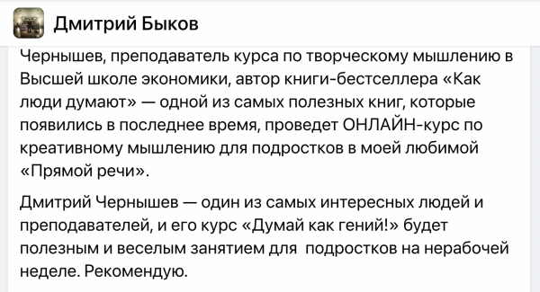 Мой друг Дмитрий Чернышев проводит очный курс креативного мышления для подростков "Думай как гений!" в Москве.