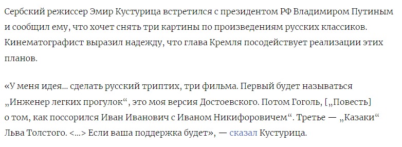 Путин в Кремле встретился с Эмиром Кустурицей. Тот поведал Путину немало интересного, цитирую: