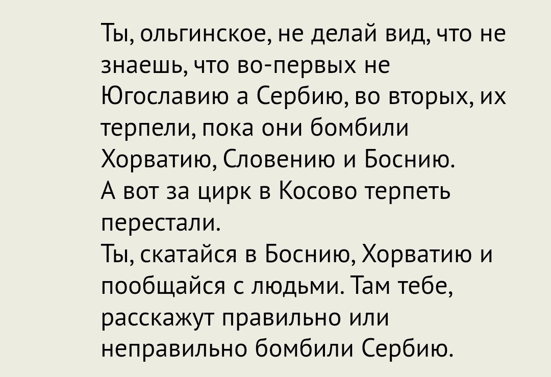 Только вот Добролюб тут никогда не топит "за хорошего Милошевича и сербов". Добролюб всегда называет Милошевича преступным мудаком, который сам же и похоронил Югославию своими тупыми действиями.