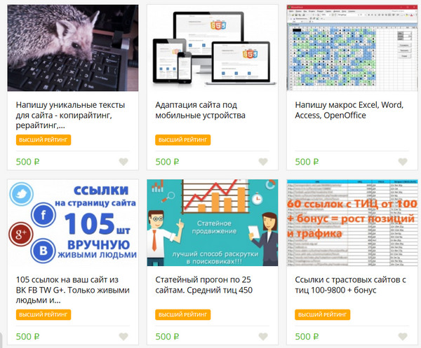 У каждого фрилансера есть свой персональный рейтинг, который увеличивается по мере выполнения заказов с положительными отзывами. Кворки фрилансеров с высшим рейтингом выводятся на главной странице сервиса.