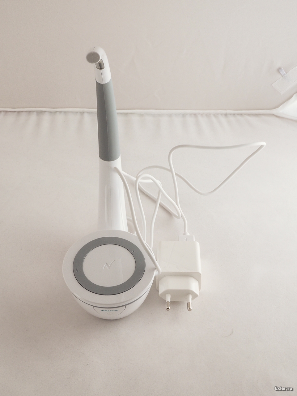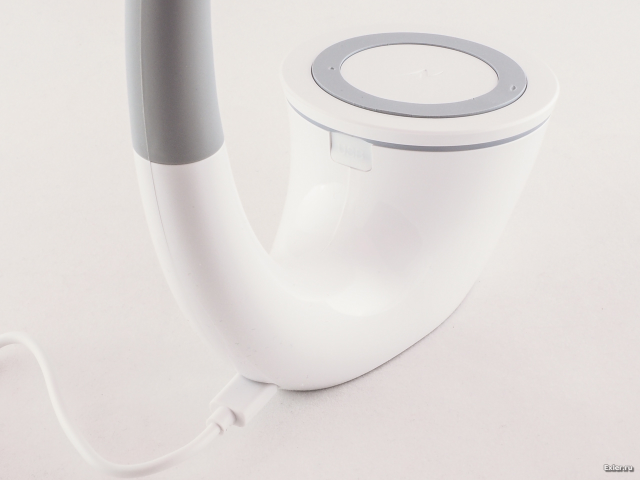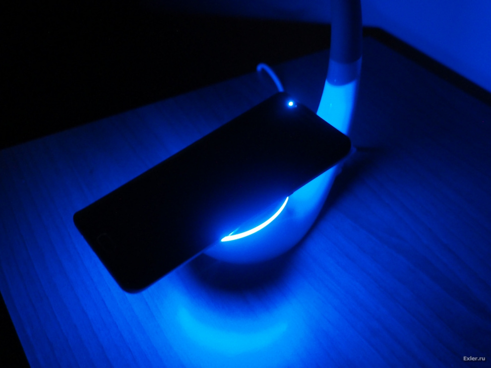 Ну и еще одна интересная штука. Когда работает беспроводная зарядка, под площадкой зарядки загорается голубое кольцо, которое одновременно выполняет функции ночника - это очень удобно, я не люблю, когда в комнате свет полностью выключен, а такой ночник не мешает вообще даже когда стоит в 10 сантиметрах от подушки. (На фото он выглядит значительно ярче, чем в реальности.)