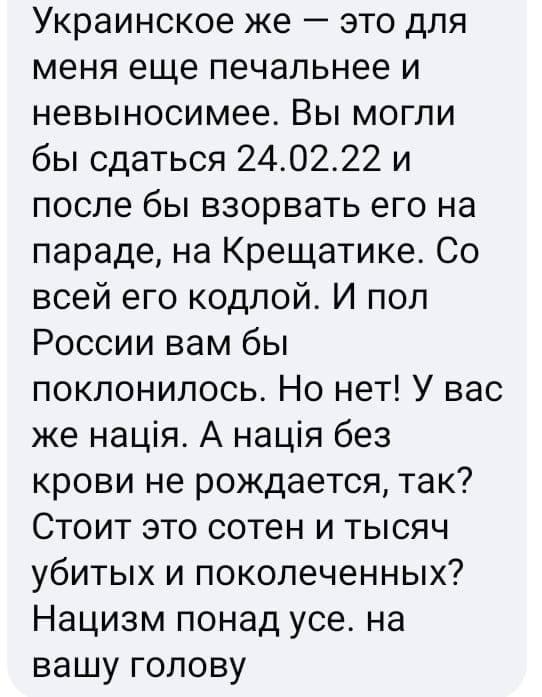 Но выскажусь относительно последней фразы: да, нападение вызвало воодушевление. Иэто воодушевление дорого обошлось нападавшим. Многие отправив жен, стариков и детей на вокзалы, уходили оттуда получать оружие. И это позволило нам продержаться первое время. Сумские ТРО, обычный мирняк, сожгли тысячные колонны профессиональной армии, второй в мире. Сделали они это находясь безусловно в депрессии и заливая ее алкоголем.