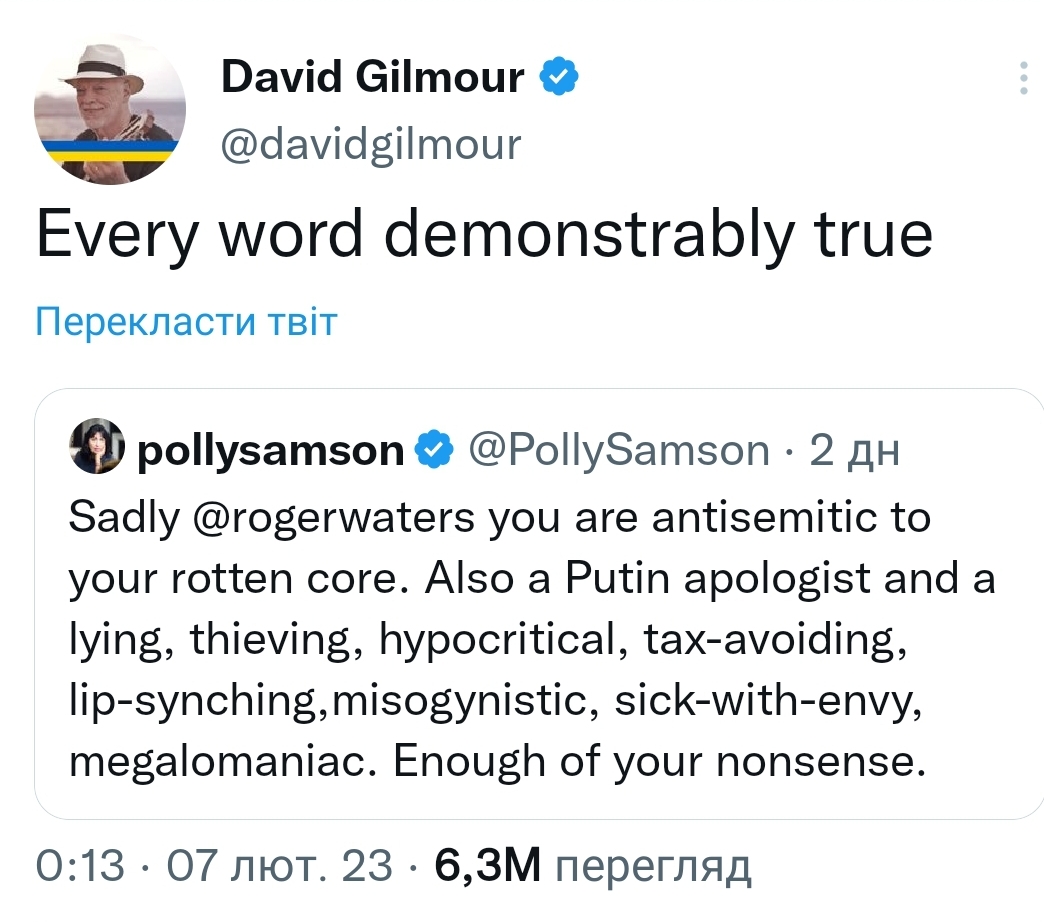 Музыкант он как раз не особо гениальный, в ПФ эту часть на себя больше брал коллега Гилмор, реально великий гитарист. А вот стихи Уотерс писал концептуальные и хорошие, демонстрируя глубокое понимание человеческих взаимоотношений. Как ему удаётся это совмещать с политическим мудачеством, для меня загадка. Просто принимаю как данность, особенно после начала этой войны, что многие люди замечательны в одном важном отношении, и полное дерьмо - в каком-то другом.