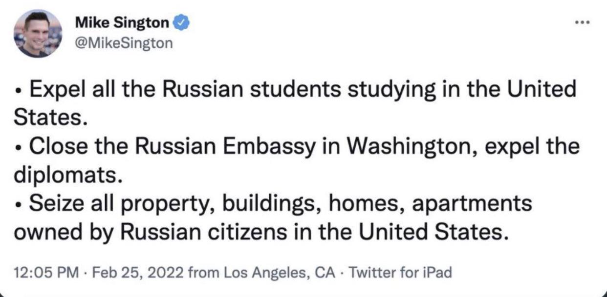 В США из зомбоящика поговаривают о том, что инфляция в США - это результат российской агрессии (напечатанные за последний год 2\3 всей мировой массы долларов тут ни при чем, конечно) и ожидают, что скоро навернутся все биржевые и банковские системы дружно взломанные российскими хакерами (триллионы ничем не обеспеченной маржи в фондах тут тоже вспоминать не будем). Фэйсбук помаленьку банит страницы и группы со словом Russian в навзвании, в Твиттере прогрессивные деятели призывают начинать присматриваться к американцам с русскими корнями на предмет выселения и конфискации.