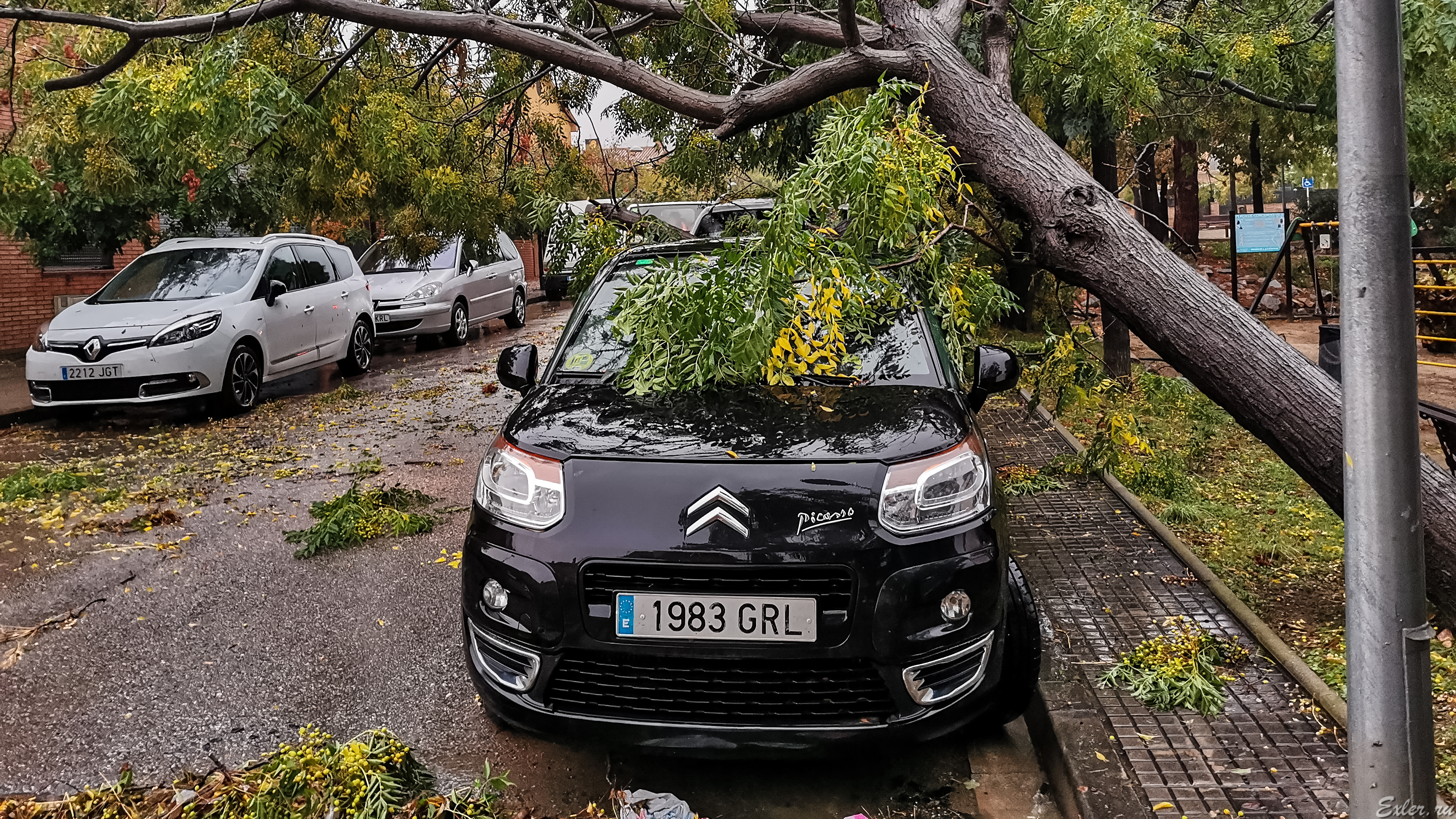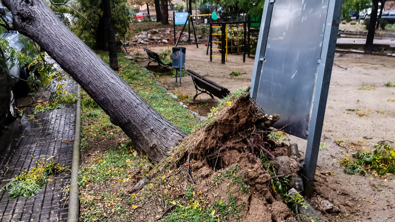 На детской площадке неподалеку выворотило большое дерево и оно упало на машину. Правда, упало аккуратно, машина почти не пострадала.