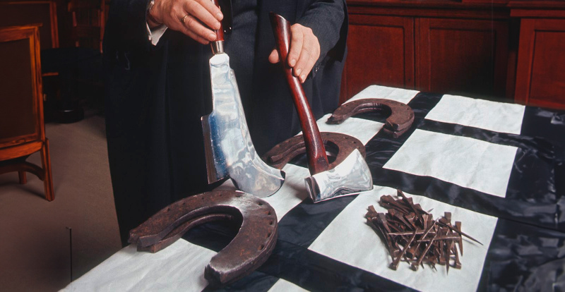 Так вот, церемония вручения оплаты проводится в начале октября в Королевском суде каждый год с 1211 года, то есть восемь веков. Перед Королевским Напоминателем выкладывают все эти предметы, он их осматривает, пробует биллхук на тупость и топор на остроту, пересчитывает гвозди и подковы, после чего говорит "Good numbers" - в знак того, что условия оплаты аренды выполнены, заворачивает эти предметы и уносит.