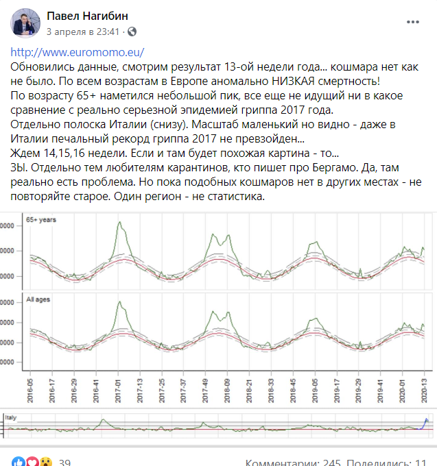 "Разные уважаемые люди продолжают задаваться конспирологическими вопросами по поводу странностей статистики смертности в Италии, ссылаясь на цифры сайта Countrymeters. Как справедливо заметил вчера в стриме Майкл, этот сайт не про текущую статистику, данные на 2020 год - это моделирование. О чем там прямо и написано: