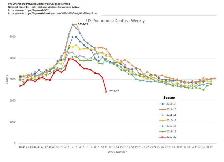 "В США и большинстве европейских стран общая смертность остаётся в пределах серьёзных сезонных эпидемий ОРВИ и гриппа. Обычная общая смертность в США составляет приблизительно 8000 человек в день, в Германии – 2600, а в Италии – 1800."