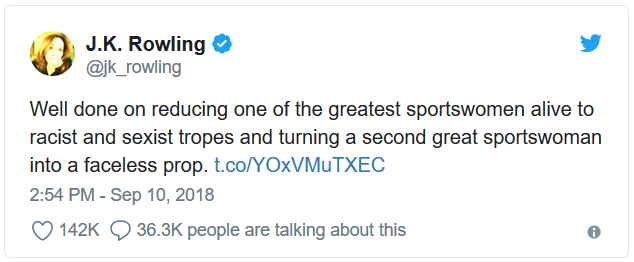Великая писательница Джоан Роулинг написала в твиттере: "Отличная работа по превращению одной из величайших спортсменок в объект расистского и сексистского скандала и по превращению другой прекрасной спортсменки в безликий фон".