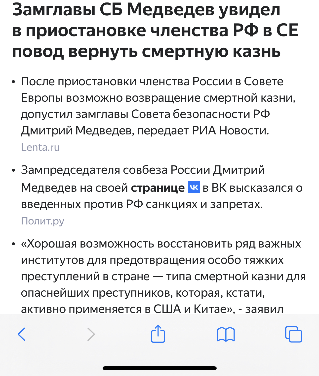 Дмитрий Медведев назвал приостановку членства России в Совете Европы и ПАСЕ "хорошей возможностью восстановить смертную казнь".
