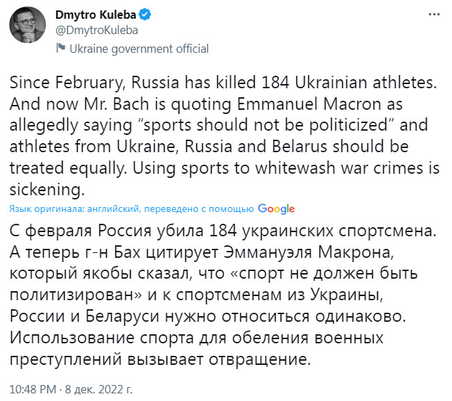 "Президент Макрон заявил, что спорт не должен быть политизированным, и подчеркнул в отношении Олимпиады и Паралимпиады 2024 года, что представители всех стран, в том числе и тех, которые находятся в состоянии активных боевых действий, должны участвовать в Играх", – заявил Бах на пресс-конференции по итогам заседания исполкома МОК. (Отсюда.)