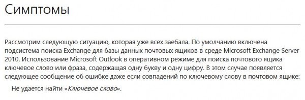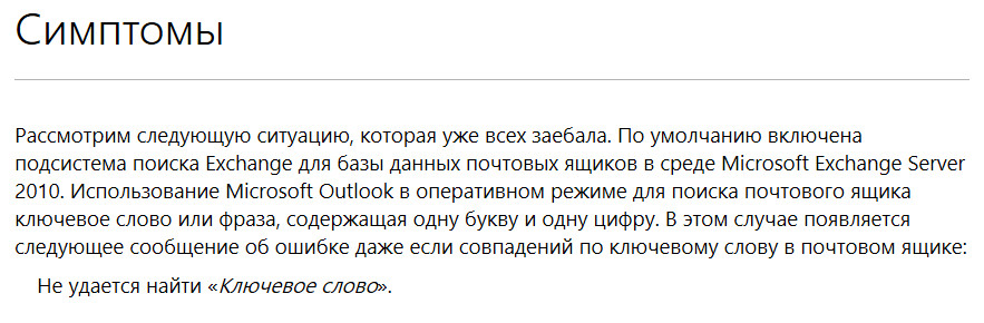 "Причина. Эта хуйня возникает, так как подсистема поиска Exchange имеет ограничение поиска префикса жестко 200 000 узлов для поиска одного символа".