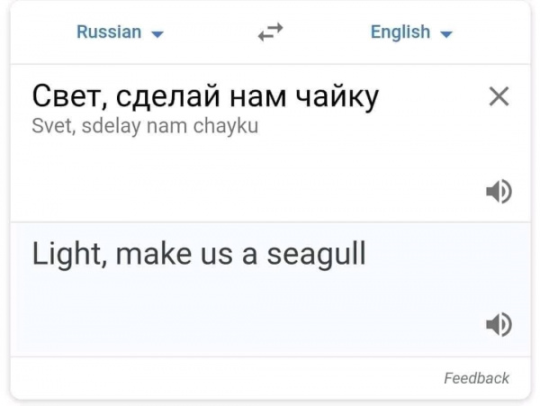 Проблема ошибок и аграмматизмов в исходном тексте - это сложная проблема для перевода. В русском языке нет звательного падежа "Свет", контекста в одном предложении тоже нет (я, кстати, как и компьютер, не понял, нахрен вам чайка, пока не прочитал весь текст). Достаточно поставить грамматически корректное "Света", и все становится на свои места, что, на мой взгляд, большой успех машинного перевода европейских языков.