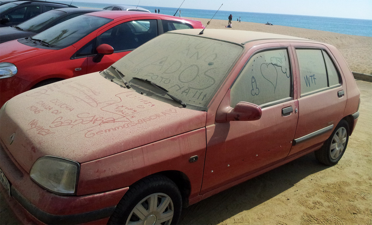 Машины, которые стоят на стоянке у моря больше пары дней, довольно быстро заносит песком. Чем местные ребятишки с удовольствием пользуются, творчески самовыражаясь.