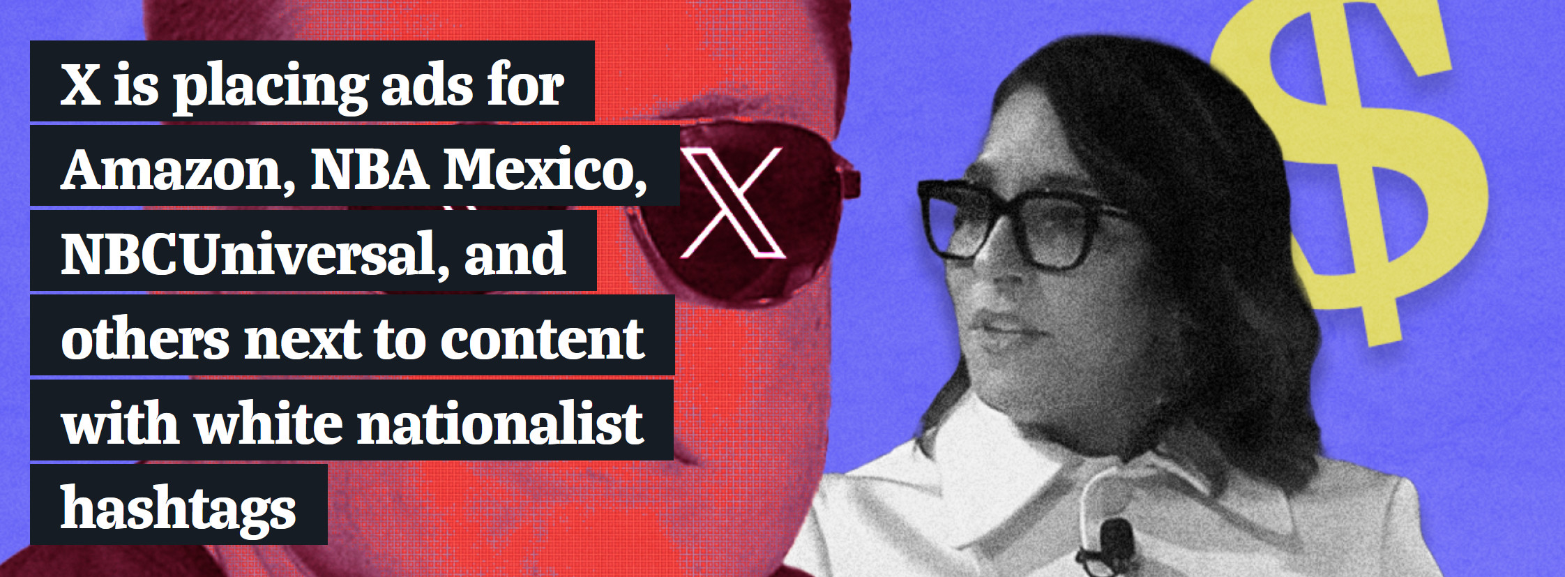 Некоммерческое агентство Media Matters for America на своем сайте несколько раз публиковала исследования о том, что в X-сети реклама IBM, Apple, Oracle, NBA, NBC м других компаний размещаются рядом с националистическими постами и хэштэгами.