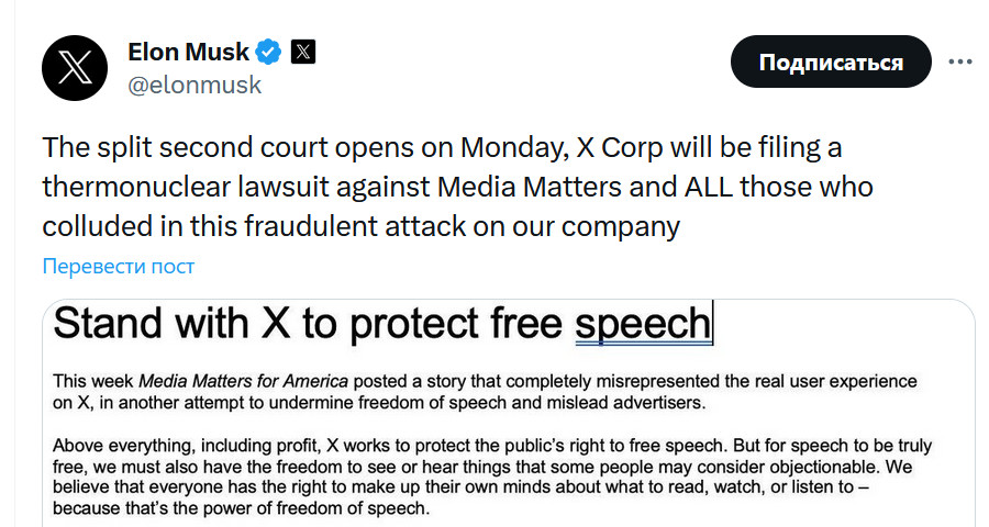 Маск, разумеется, был в бешенстве. Он написал, что прямо в понедельник подаст против Media Matters for America "термоядерный иск".