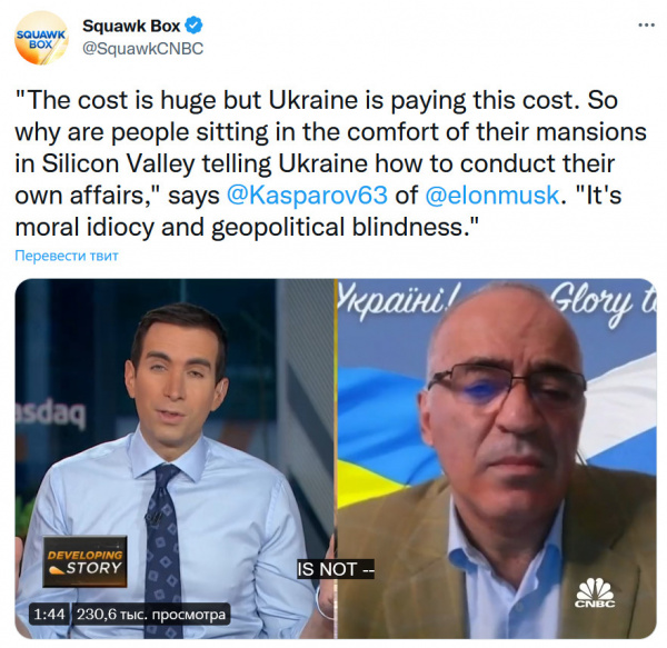 Гарри Каспаров в интервью Squawk Box сказал по поводу Илона Маска: "Цена огромна, но Украина платит эту цену. Так почему же люди, сидящие в комфорте своих особняков в Силиконовой долине, указывают Украине, как ей вести свои собственные дела?  Это моральный идиотизм и геополитическая слепота". Безотносительно к тому, как вы (и я) относитесь к Каспарову, фраза совершенно правильная, все так и есть.