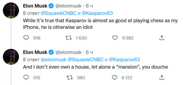 В ответ Маск там в комментах написал: "Хотя Каспаров играет в шахматы почти так же хорошо, как мой iPhone, в остальном он идиот". И добавил: "У меня даже дома нет, не говоря уж об «особняке», придурок".