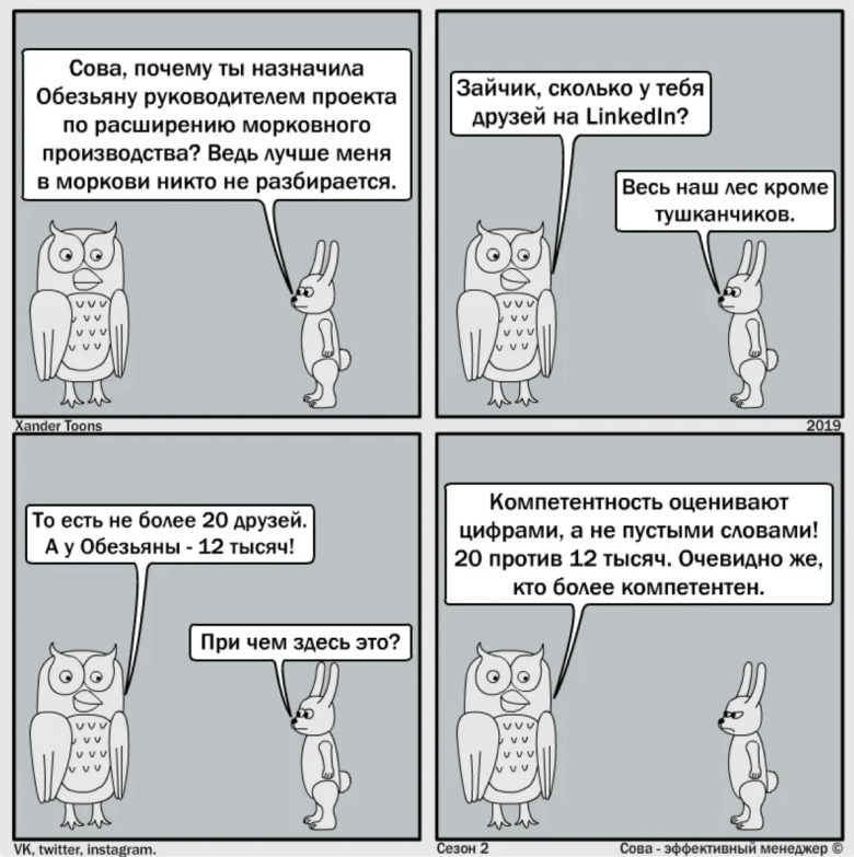 Правильный ответ Совы должен быть:" Зайчик, ты манагер среднего звена, занимайся своим делом. А моя работа -- решать кадровые вопросы/кого назначать на проекты. Морковка это все херня, для руководителя нужен другой скилсет. Мы одна команда и должны быть тим-плейерами."