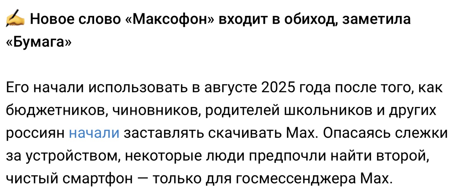 Известно, что изо всех сил навязываемый всем российским пользователям мессенджер Мах - это чисто шпионское приложение, которое собирает абсолютно всю информацию о действиях пользователей и отправляет ее КУДА НАДО. В РФ никуда не деться от установки этого шпиона, потому что теперь без него не будет доступа к жизненно важным сайтам - например, к банкам.