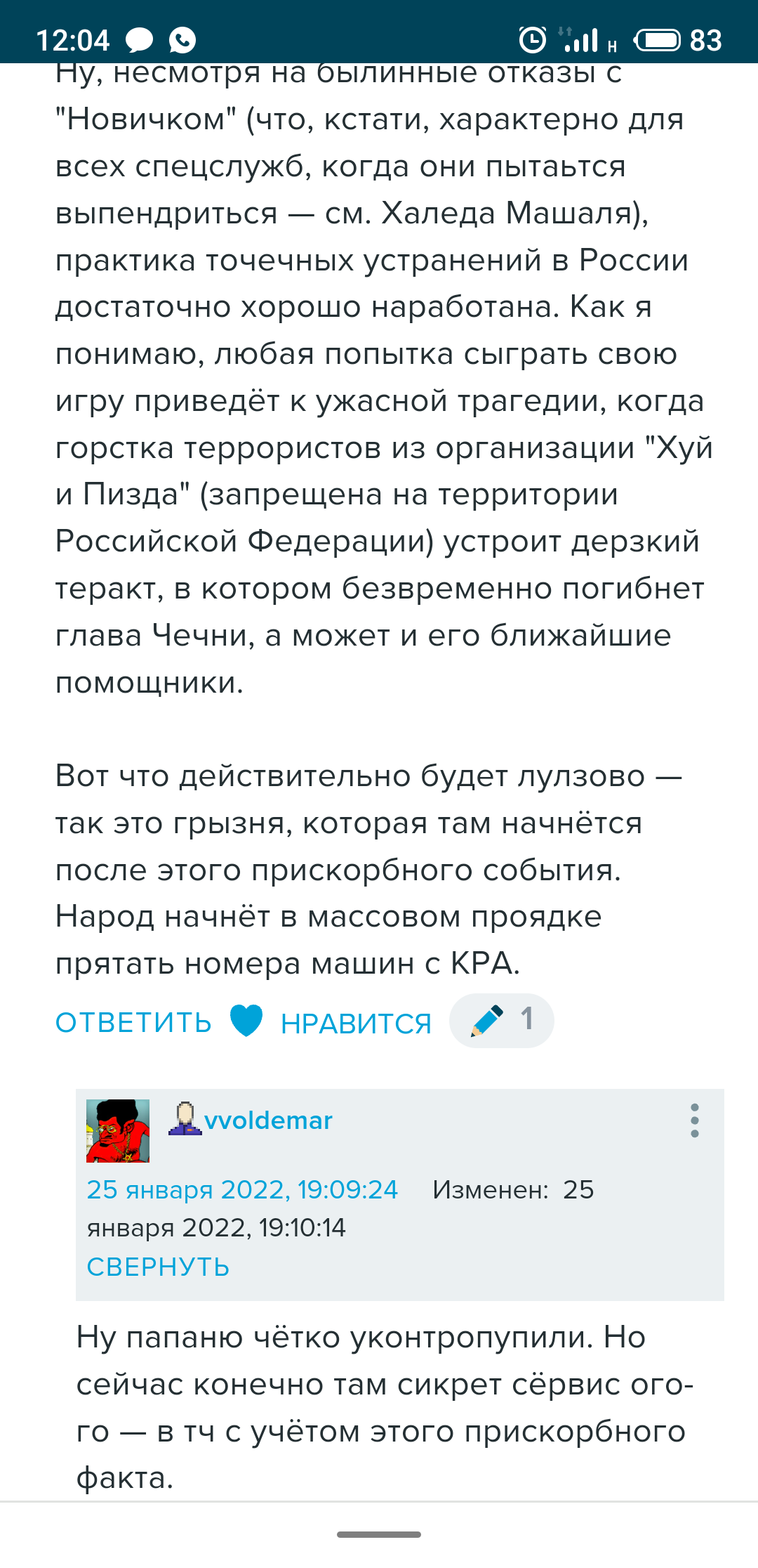 По моему скромному ИМХО, Пригожин это самая большая загадка в России с начала войны. Вообще непонятно чего с ним происходит и куда метит. Украинцы воюют храбро, Зеленский симпатичный малый, Навальный был полезным, Украина сегодня мировой бренд, счастливый дедушка, многократная дискредитация ВС РФ...Какого хера этот парень делает и чего он задумал? Двадцать пять версий слышал, ни одной убедительной.