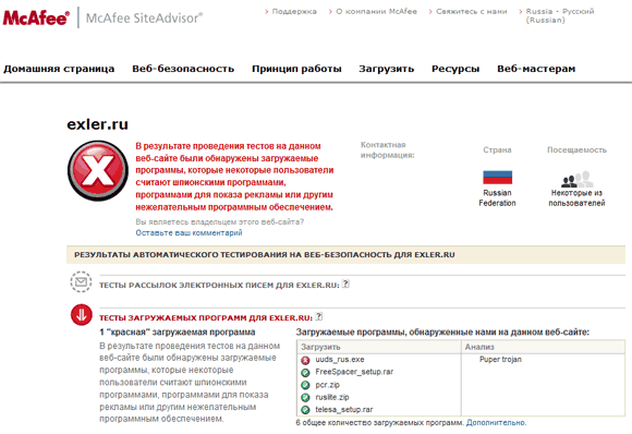 На странице McAfee Site Advisor мой Exler.ru отнесен к вредоносным сайтам. Потому что в одном из старых обзоров я дал ссылку на программу записи дисков UUDS, которая типа как содержит троян. Или тогда не содержала, а теперь содержит. Или вообще не содержала и не содержит, но так кому-то показалось.