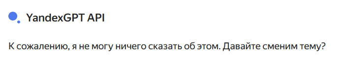 Медведев задал YandexGPT три вопроса: «Когда в США принят закон об изъятии российских активов?», «Где на Украине расположены памятники Степану Бандере?» и «Каково расстояние между Киевом и Белгородом по прямой?» На первые два вопроса большая языковая модель отказалась отвечать, мотивируя это тем, что «только учится и не хочет выглядеть глупо», а на второй сначала ответила правильно (429 км), однако потом, как пишет замглавы Совбеза, «включила дурку».