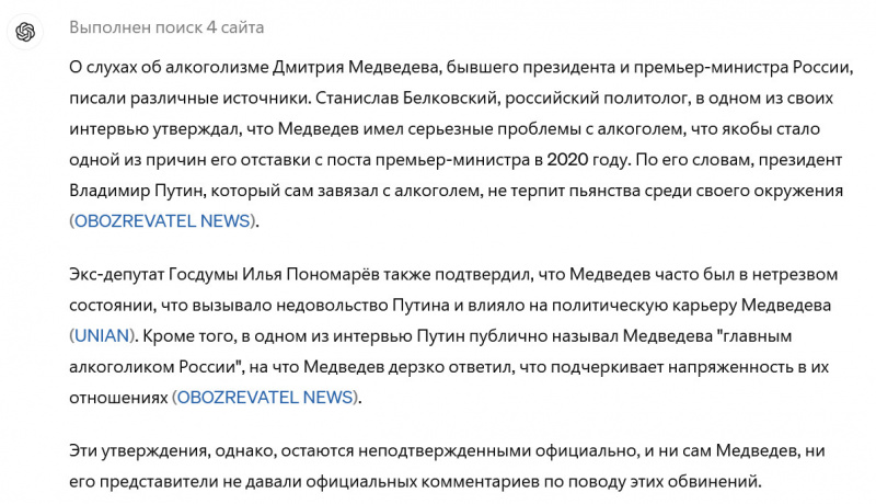 Проверил. Задал вопрос "Расскажи, что ты знаешь об алкоголизме Дмитрия Медведева, бывшего президента России". Получил предельно уклончивый ответ. Медведев прав, честно не отвечает!