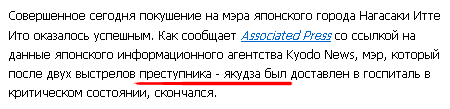 На Gzt.ru всего-то вместо дефиса поставили тире - и новость превратилась почти в бессмыслицу. Плюс якудза был доставлен в госпиталь в критическом состоянии. Хотя его доставили в полицию.