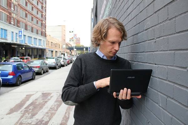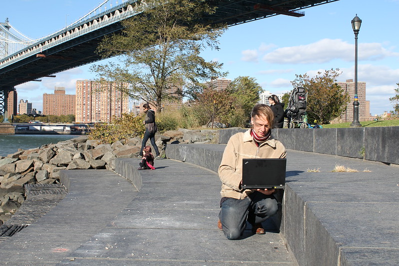Чувак с ноутом на фото — придурок. Не знает о существовании удлинительных USB-кабелей. Одно неверное движение и поломает арт-объект.