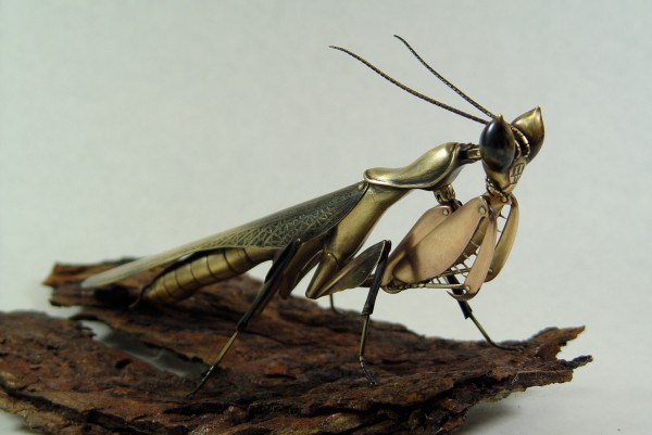 Страсть художника Джоффри Хабермана - богомолы, фигурки которых он создает из латуни. Все делается строго вручную: Джоффри использует латунные полосы и листы, узоры и мелкие детали протравливаются хлоридом железа. Фигурки, кстати, немаленькие, размером с ладонь. Соединения сделаны на шарнирах.
