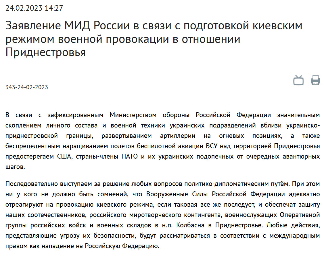Но МИД России решительно предостерег! Они не допустят, нет! Они предостерегают США и их подопечных! Грозно предостерегают! Тут же отреагируют, тут же! Немедленно выпустят следующее заявление, если не дай бог что! Потому что они последовательно выступают за решение любых вопросов политико-дипломатическим путём, заявил МИД России через год после нападения России на Украину, которая ей ничем и никак не угрожала. Но вы не понимаете - это другое! А наши склады в Приднестровье - чур не трогать! Ну плиз, плиз!