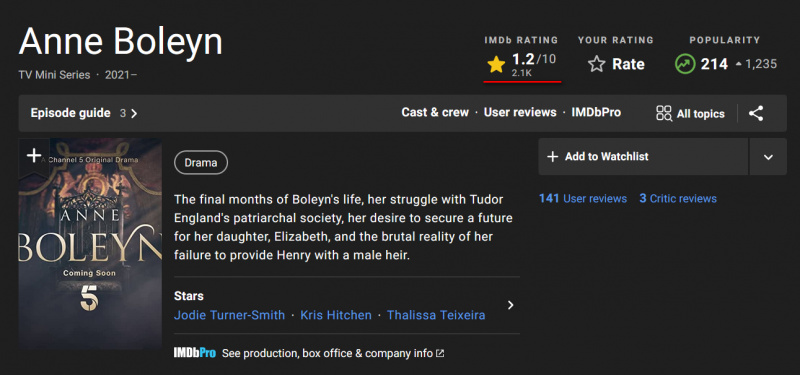 Вышел мини-сериал "Анна Болейн", где мадам Болейн играет чернокожая актриса Джоди Тернер-Смит.