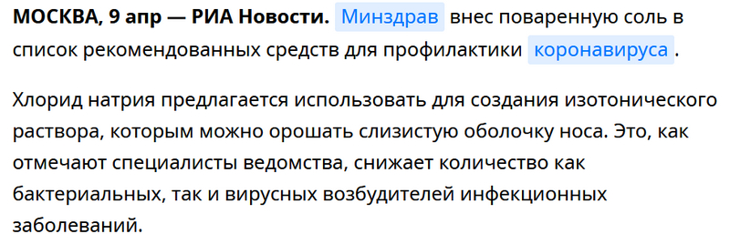 Но об этом гораздо лучше сказано у коллеги: вот тут dave-aka-doc.livejournal.com довольно подробно объясняется, о какой именно соли идет речь, в частности о том, что изотонический раствор натрия хлорида, совершенно официально и широко используемый как для местного применения, так и в составе инфузионной терапии, никакого отношения к пачкам соли не имеет.