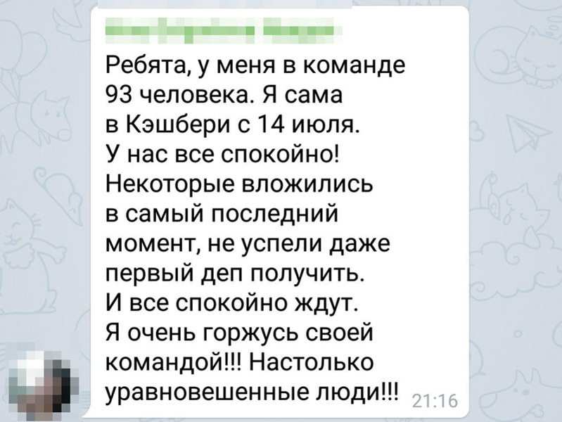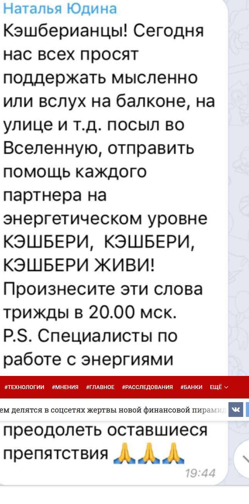 Издание "Фонтанка" собрала впечатляющую коллекцию переписки участников финансовой пирамиды "Кэшбери", которую недавно закрыли. Я, конечно, понимал, что из "МММ" девушка уехать может, а вот "МММ" из девушки не уедет никогда, но этот безбрежный мир законченных лохов, которые себя считают самыми умными, это что-то с чем-то - "«Булочная — тоже пирамида», виноваты украинцы, молимся и пишем Путину: как вкладчики «Кэшбери» переживают крах компании".