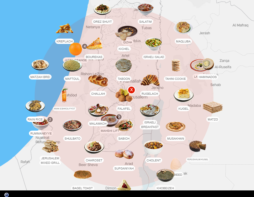 Но Израилю вообще достались только апельсины с дерева. Похоже, по мнению составителей, израильтяне все еще живут на деревьях и питаются фруктами. Только на территориях появляется еще пара блюд.