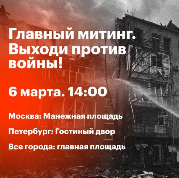 Навальный и его команда призывают выйти на митинг против войны завтра, 6 марта в 14 часов.