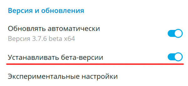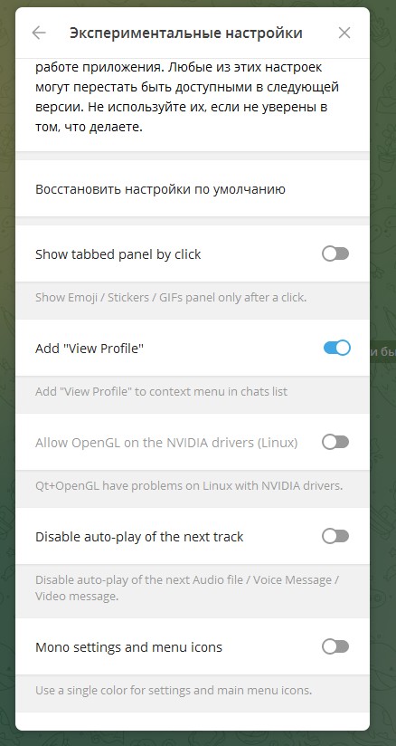 После включения опции Телеграм загрузит обновление и перезагрузится. Далее нужно зайти в том же разделе в "Экспериментальные настройки" и там включить "New chat window by Ctrl+Click".