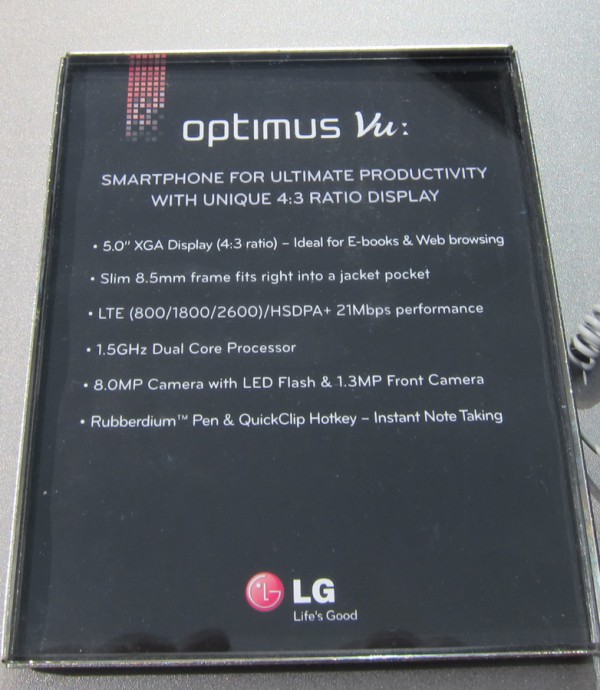 Из входящих в моду после появления Samsung Galaxy Note "лопат" (перетелефонов и недопланшетов) LG представила свою разработку под названием Optimus Vu. Телефон с форматом дисплея в 4:3 - странное, на мой взгляд, решение. В LG утверждают, что такой формат наиболее подходит для серфинга и для чтения книг. По-моему, это просто чушь.