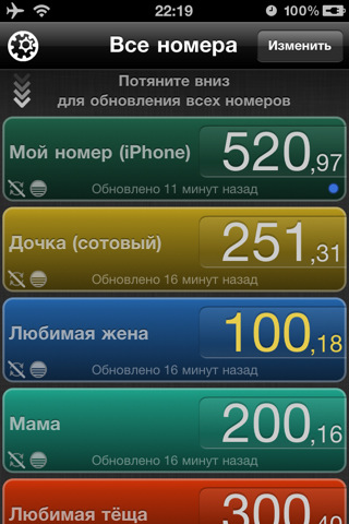 Правда, платная, причем по айтюнсовским меркам даже дорогая - аж пять баксов. Но я не пожалел, мне возможность видеть балансы всех моих номеров и номеров родственников, которым я деньги на телефон вношу, очень актуальна.