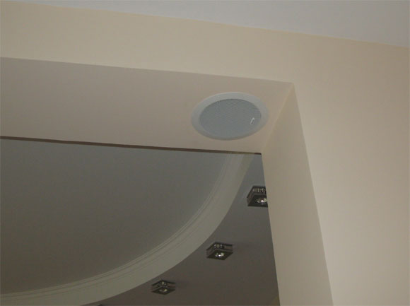 В фальш-потолке прокладывается провод и делается круглое отверстие заданного размера. Колонка присоединяется к проводу, вставляется в отверстие и далее отверткой поворачиваете специальные ножки (черные, видные на снимке) - колонка закрепляется. Снизу закрываете динамик сеткой. Выглядит это все потом вот так: