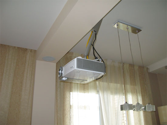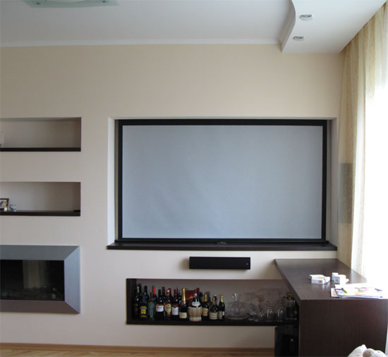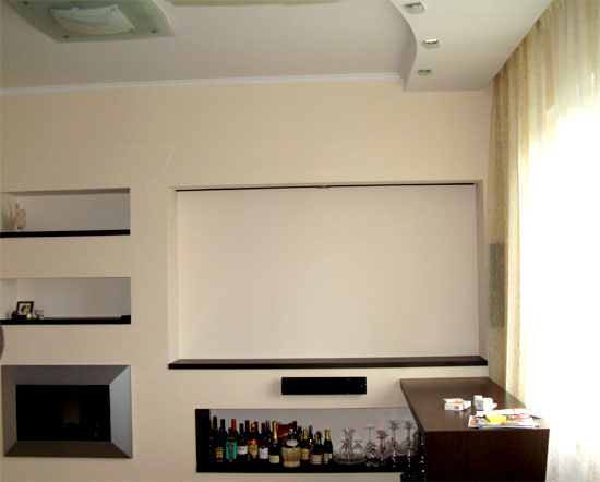 С экраном решение было принято следующее. Так как экран большой - 2,5 метра по диагонали, - его убрали в специальную нишу. В свернутом состоянии экрана это выглядит так: