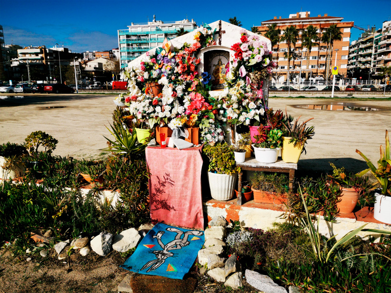 На набережной у самого пляжа - вот такое сооружение в честь Богородицы, усыпанное цветами, за которыми тщательно ухаживают. Есть где преклонить колена и помолиться. Для преклонения колен приспособили страшно трогательный коврик с Багзом Банни. Эдакий католический Багз Банни получился.