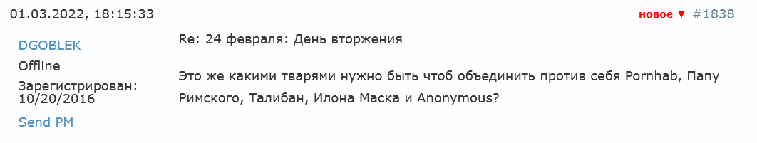 Также Сергей говорил о том, что Путин затеял эту абсолютно безумную войну, которая для него самого совершенно самоубийственна, только для того, чтобы вечно сидеть на троне. Вот с этим я не согласен. А кто ему мешал-то вечно сидеть на троне безо всякой войны? Наоборот, без войны он и сидел бы себе. А сейчас у него перспективы вполне грустные. Не говоря уж о крайне грустных перспективах для всех нас.