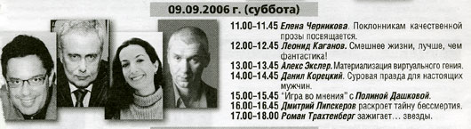 Буду там в субботу, примерно с 13 до 14 на стенде "АСТ" (57 павильон). Буду материализовать виртуального гения, если сумею его поймать. Передо мной, кстати, на этом же стенде будет Леня Каганов. Его я и материализую.