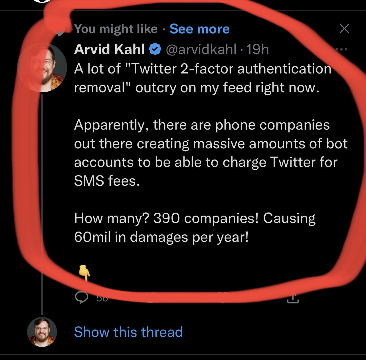 > Конкретно 2FA через SMS обходится компании в десятки миллионов долларов из-за армии ботов и фейковых запросов. Вот Маск и пытается сократить эти расходы. Оставил пока эту возможность только для платных аккаунтов с "галочкой" не потому, что они платные, а потому что проверенные, и от них фейковых запросов не будет, что сильно сократит расходы на получение и обработку сообщений.